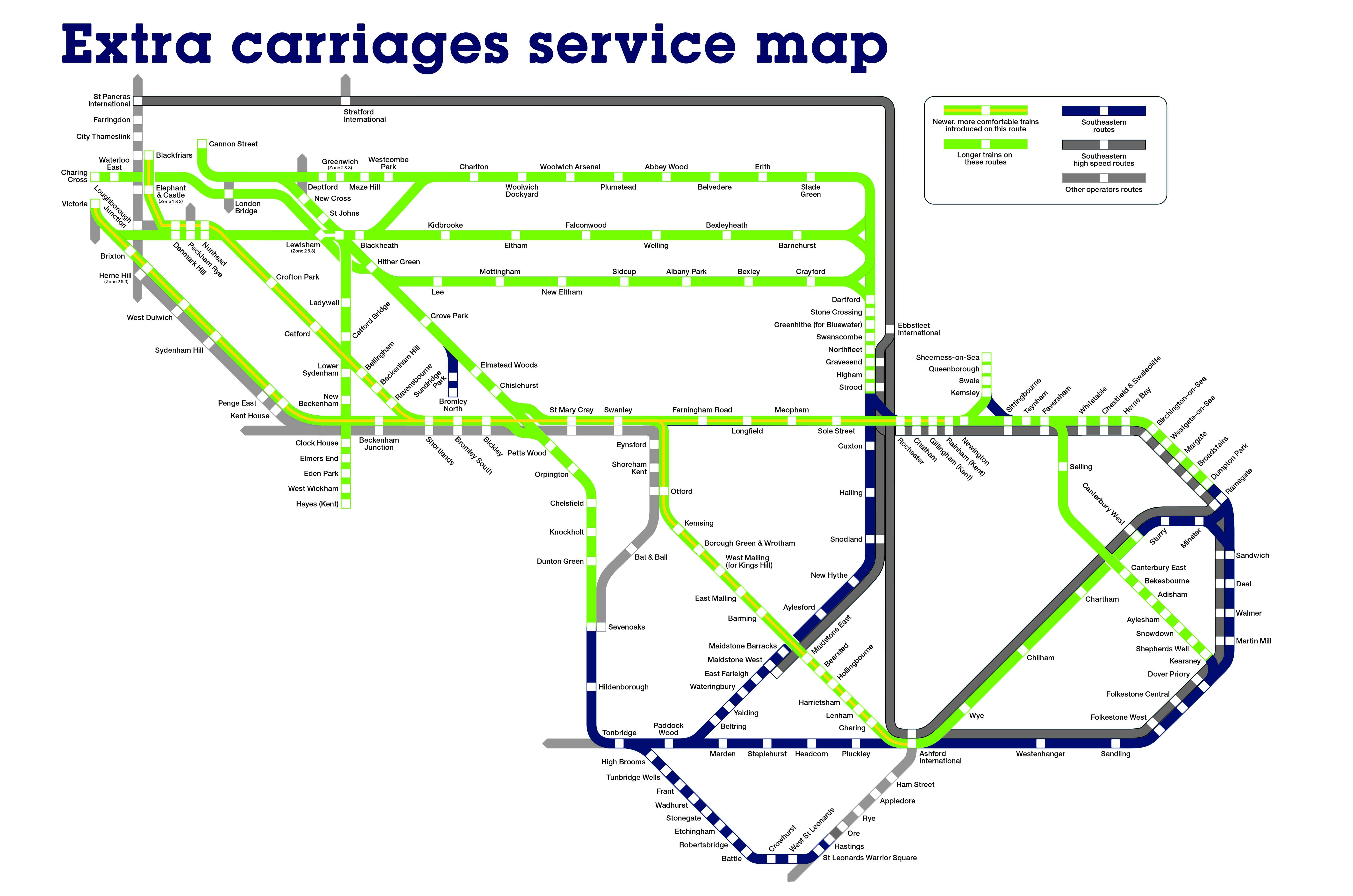 On the Hayes, Bexleyheath, Woolwich, Sidcup, Bromley South and Grove Park lines, passengers will see a number of peak-time trains lengthened from eight to ten carriages while some six-car trains will lengthen to eight.