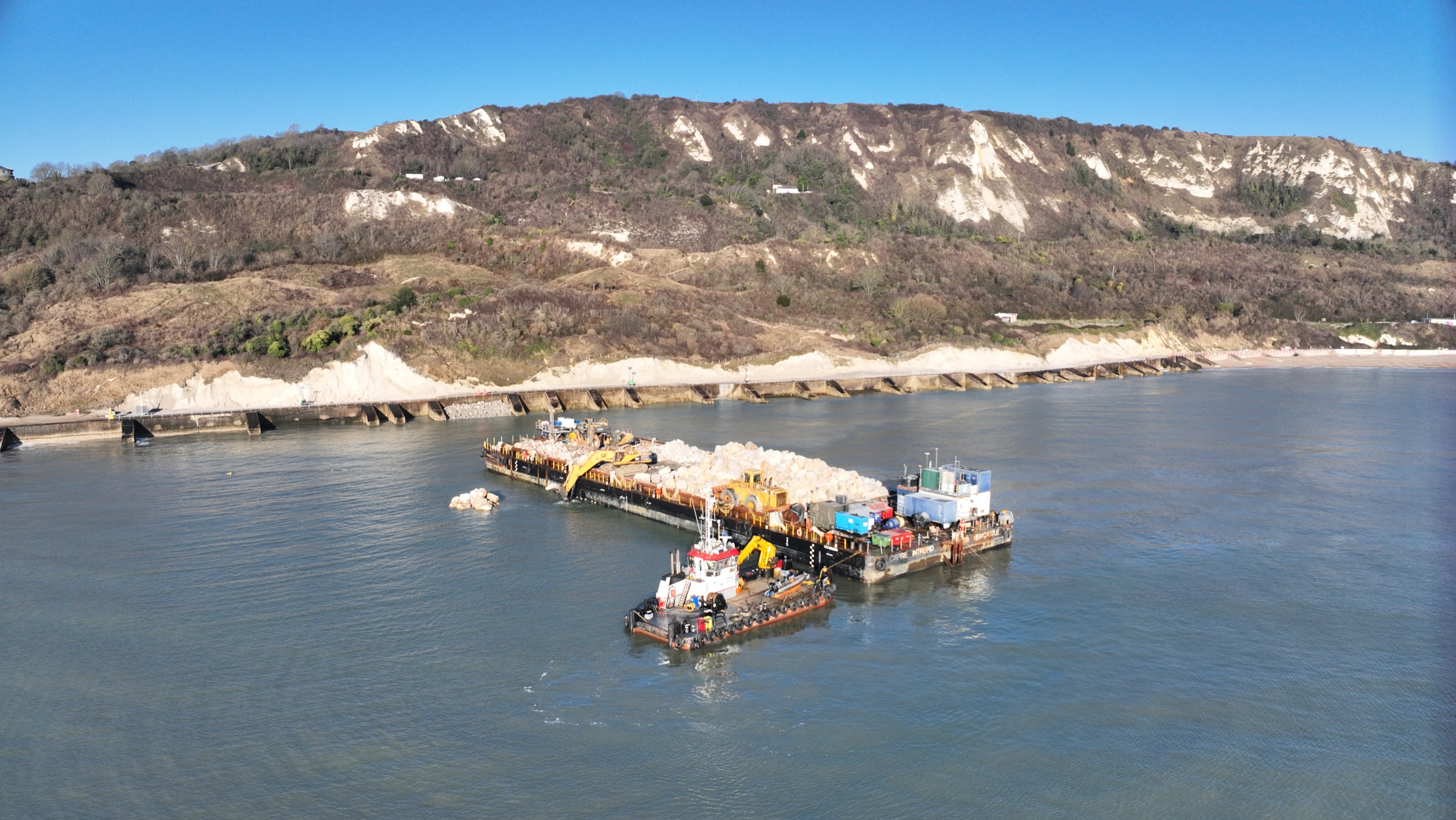 Progress is being made in a major project that involves the installation of large rocks on the beach at Folkestone Warren, so that the coastal railway between Folkestone and Dover can be protected and ensuring that passenger trains can continue to run safely.