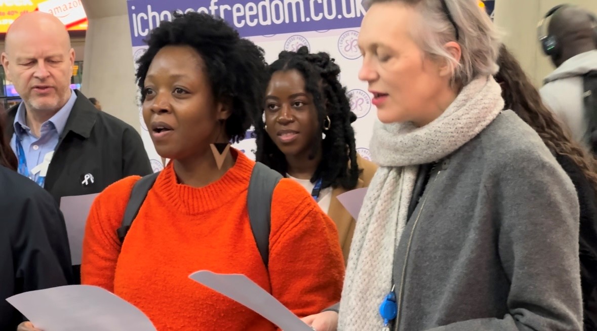 The choirs performed at London Bridge Station dressed in black and white to match the White ribbon colours.